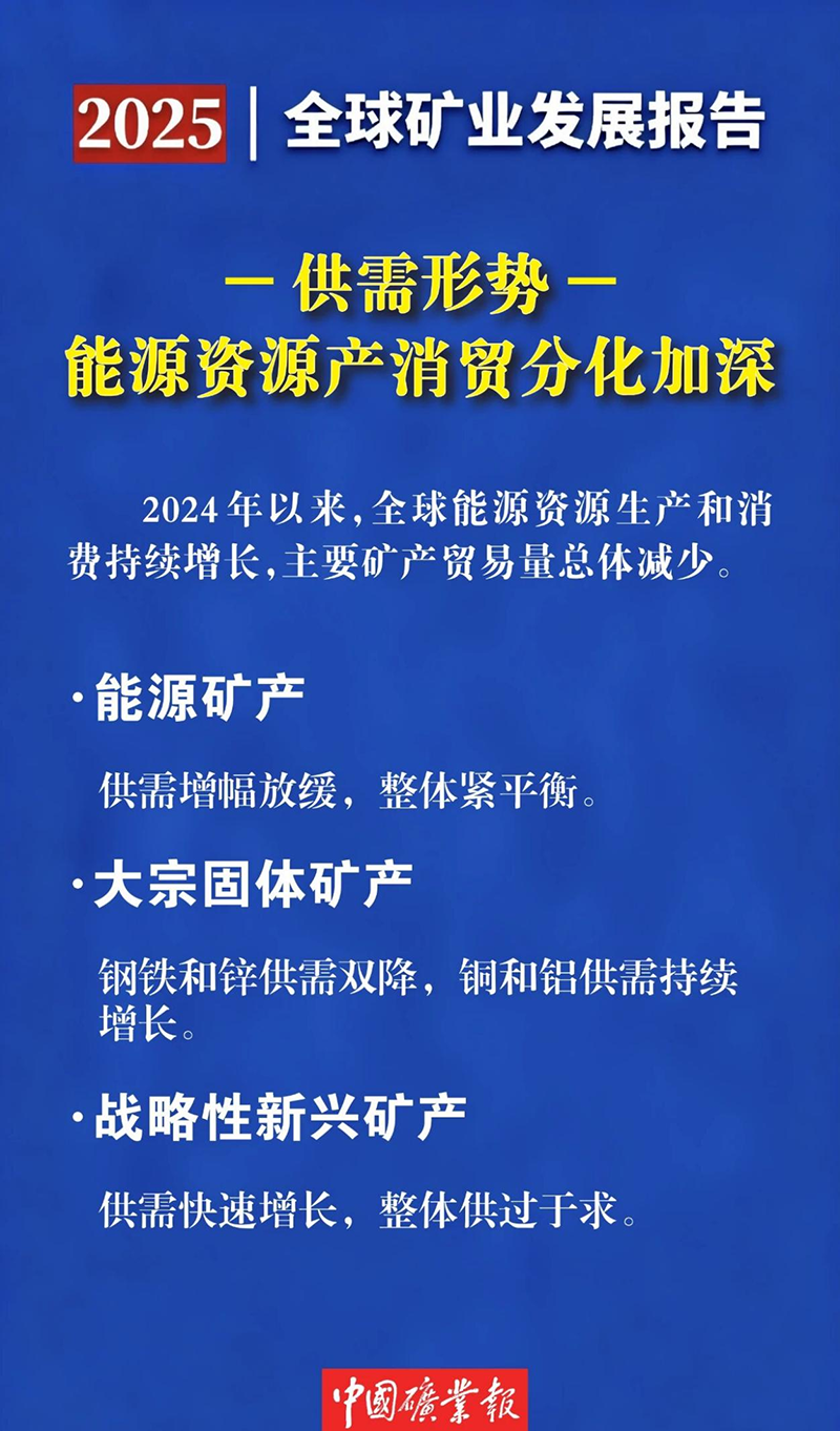 供需方面,《報(bào)告》顯示,全球能源資源生產(chǎn)和消費(fèi)持續(xù)增長,供需結(jié)構(gòu)矛盾加劇。其中,能源礦產(chǎn)供需增幅放緩,整體處于緊平衡。大宗固體礦產(chǎn)中,鋼鐵供需雙降,供應(yīng)過剩程度增加;銅供需持續(xù)增長,供應(yīng)缺口擴(kuò)大;鋁供需雙升,供應(yīng)過剩程度減小;鋅供需雙降,轉(zhuǎn)向供不應(yīng)求。戰(zhàn)略性新興礦產(chǎn)供需快速增長,均表現(xiàn)為供過于求。貴金屬礦產(chǎn)中,黃金供需雙升,但供過于求;白銀供降需增,供應(yīng)缺口維持高位;鉑金供需雙升,供不應(yīng)求格局加深。農(nóng)用礦產(chǎn)供需雙升,鉀肥供應(yīng)過剩程度增大而磷肥減小。