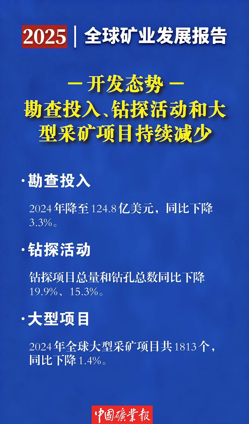 勘查開發(fā)方面,《報(bào)告》顯示,全球勘查投入、鉆探活動和大型采礦項(xiàng)目持續(xù)減少。2024年,全球主要固體礦產(chǎn)勘查投入124.8億美元,同比下降3.3%;鉆探項(xiàng)目總量和鉆孔總數(shù)同比分別下降19.9%和15.3%;全球大型采礦項(xiàng)目共1813 個(gè),同比下降1.4%。
