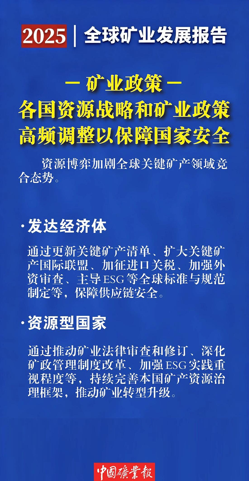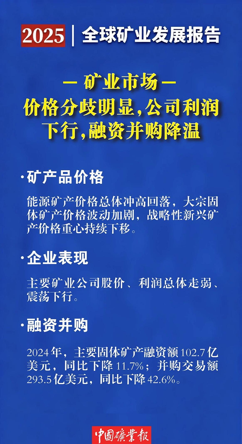 市場價(jià)格方面,《報(bào)告》顯示,國際礦產(chǎn)品價(jià)格分歧顯著,礦業(yè)公司股價(jià)和利潤總體下行,礦業(yè)融資和并購交易市場雙雙降溫。能源礦產(chǎn)價(jià)格總體沖高回落,煤炭均價(jià)較2023年下降超兩成;大宗固體礦產(chǎn)價(jià)格波動加劇,鐵礦石價(jià)格年內(nèi)下跌超三成,銅、鋁、鋅價(jià)格略有上漲;戰(zhàn)略性新興礦產(chǎn)供強(qiáng)需弱,價(jià)格重心持續(xù)下移;農(nóng)用礦產(chǎn)價(jià)格先抑后揚(yáng),市場逐步回暖。全球主要礦業(yè)公司股價(jià)總體走弱、震蕩下行。2024年全球主要固體礦產(chǎn)融資額同比下降11.7%,主要固體礦產(chǎn)并購交易額和項(xiàng)目數(shù)同比分別下降42.6%、31.8%?!秷?bào)告》指出,關(guān)鍵礦產(chǎn)已成為各國國家安全和資源戰(zhàn)略的重要組成部分,資源博弈加劇全球關(guān)鍵礦產(chǎn)領(lǐng)域競合態(tài)勢。發(fā)達(dá)國家通過更新關(guān)鍵礦產(chǎn)清單、設(shè)置貿(mào)易壁壘、強(qiáng)化資源聯(lián)盟、主導(dǎo)合規(guī)標(biāo)準(zhǔn)等持續(xù)推動供應(yīng)鏈區(qū)域化和產(chǎn)業(yè)本土化回流;資源民族主義抬頭、出口管制升級和礦業(yè)政策分歧等進(jìn)一步割裂全球市場。資源型國家通過推動礦業(yè)法律審查和修訂、深化礦政管理制度改革、加強(qiáng)ESG實(shí)踐重視程度等手段持續(xù)完善本國礦產(chǎn)資源治理框架。伴隨全球能源轉(zhuǎn)型和新一輪科技革命的縱深推進(jìn),面向勘查大數(shù)據(jù)的AI技術(shù)、地球物理技術(shù)裝備和天-空-地立體遙感找礦技術(shù)體系等逐步完善,加速推動全球礦業(yè)向數(shù)字化、智能化、綠色化轉(zhuǎn)型升級。