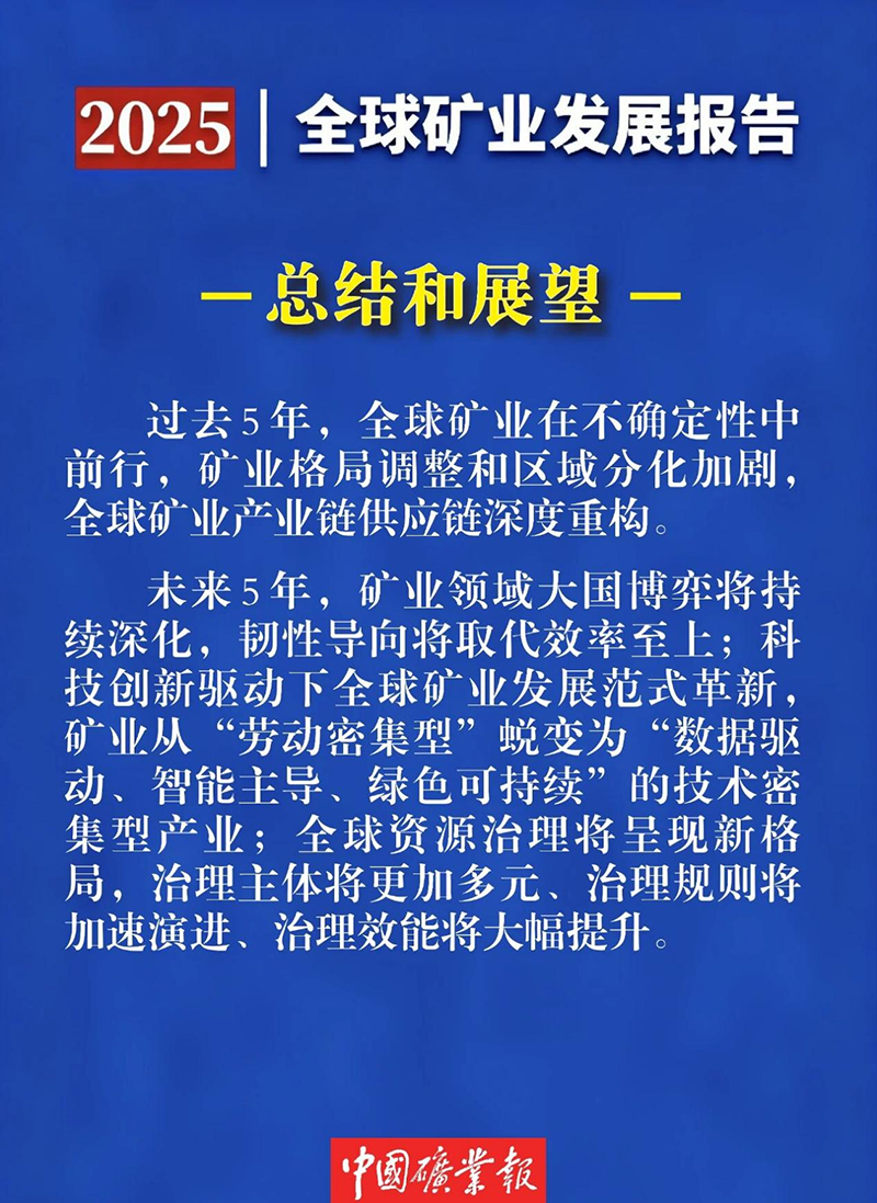 《報(bào)告》預(yù)計(jì),隨著新能源等礦產(chǎn)需求持續(xù)擴(kuò)大,礦業(yè)領(lǐng)域大國博弈將進(jìn)一步深化,韌性導(dǎo)向?qū)⑷〈手辽???萍紕?chuàng)新驅(qū)動下全球礦業(yè)發(fā)展范式革新,推動全球礦業(yè)從“勞動密集型”蛻變?yōu)?/span>“數(shù)據(jù)驅(qū)動、智能主導(dǎo)、綠色可持續(xù)”的技術(shù)密集型產(chǎn)業(yè)。百年變局將重塑全球資源治理合作格局,治理主體將更加多元,治理規(guī)則將加速演進(jìn),治理效能將大幅提升?!秷?bào)告》呼吁,各國應(yīng)加強(qiáng)關(guān)鍵礦產(chǎn)領(lǐng)域互利合作,共同維護(hù)產(chǎn)業(yè)鏈供應(yīng)鏈穩(wěn)定暢通,攜手構(gòu)建礦業(yè)命運(yùn)共同體,破解全球資源困境,實(shí)現(xiàn)可持續(xù)發(fā)展,為世界經(jīng)濟(jì)增長貢獻(xiàn)力量。
