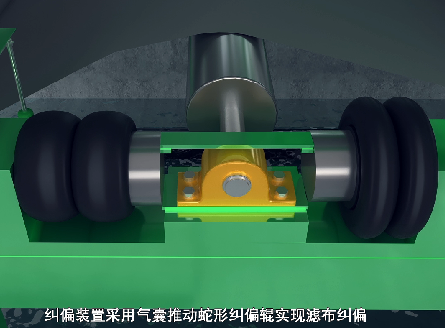 濾布在運(yùn)轉(zhuǎn)過(guò)程中可能會(huì)出現(xiàn)跑偏的現(xiàn)象,利用濾布糾偏裝置糾正濾布偏移方向,使濾布處于正常工作狀態(tài)。