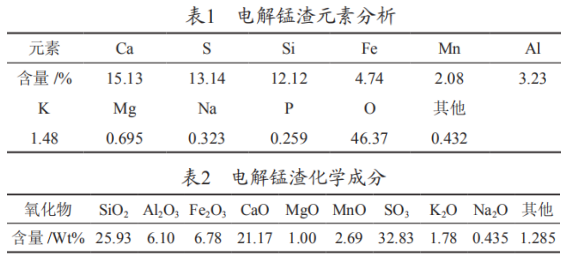 電解錳渣為粉末狀固體廢棄物,其為黑色細(xì)小顆粒,水分含量較多,平均含水量在30% 左右。本文對所選貴州地區(qū)電解錳渣中化學(xué)成分進(jìn)行分析測試,發(fā)現(xiàn)其主要元素組成為 O、P、K、Ca、Mg、S、Si、Mn、Fe、Na、Al 等,元素分析見表1。電解錳渣化學(xué)組成及含量見表2。圖1為所選電解錳渣 XRD 檢測結(jié)果,得出該電解錳渣的主要成分,含有的主要物相為石英(SiO2)、黃鐵礦(FeS2)、硫酸鈣(CaSO4)、生石膏(CaSO4· 2H2O)、氧化鋁以及氧化錳等。