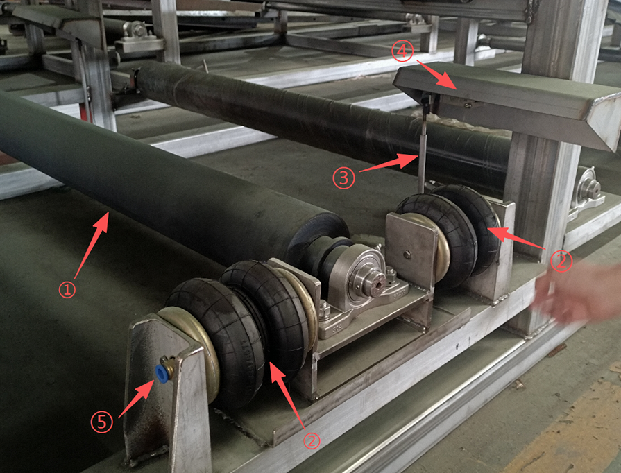 在正常運(yùn)轉(zhuǎn)中,濾布是不會(huì)碰到糾偏裝置的檢測(cè)桿。當(dāng)濾布跑偏時(shí),濾布會(huì)碰到檢測(cè)桿,檢測(cè)桿偏移,自動(dòng)糾偏裝置中的氣囊會(huì)一側(cè)充氣,一側(cè)放氣,帶動(dòng)糾偏輥蛇形偏移,使濾布改變偏移方向,恢復(fù)到正常運(yùn)轉(zhuǎn)軌跡。