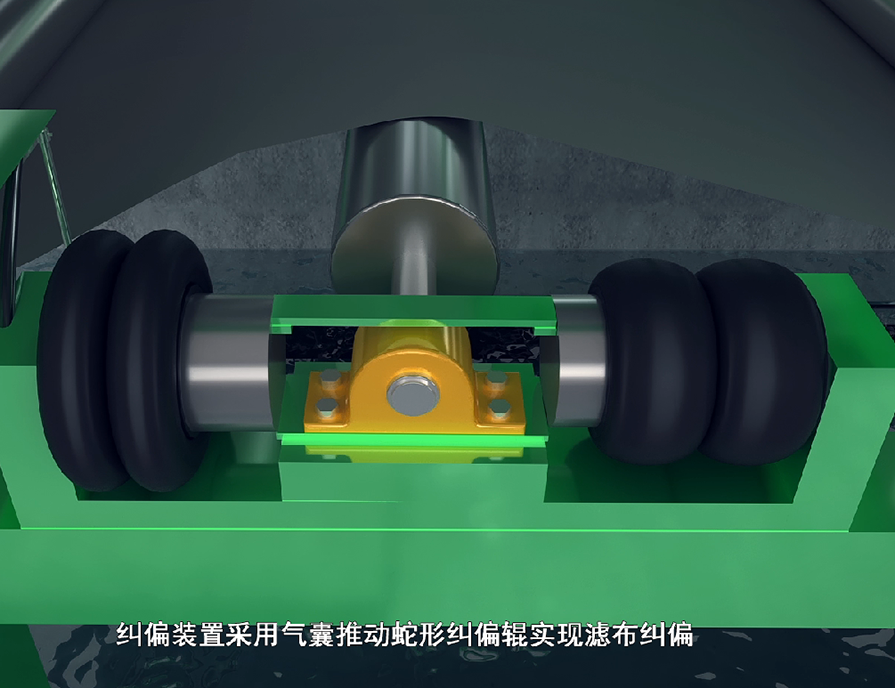濾布在運(yùn)轉(zhuǎn)過(guò)程中可能會(huì)出現(xiàn)跑偏的現(xiàn)象,利用濾布糾偏裝置糾正濾布偏移方向,使濾布處于正常工作狀態(tài)。