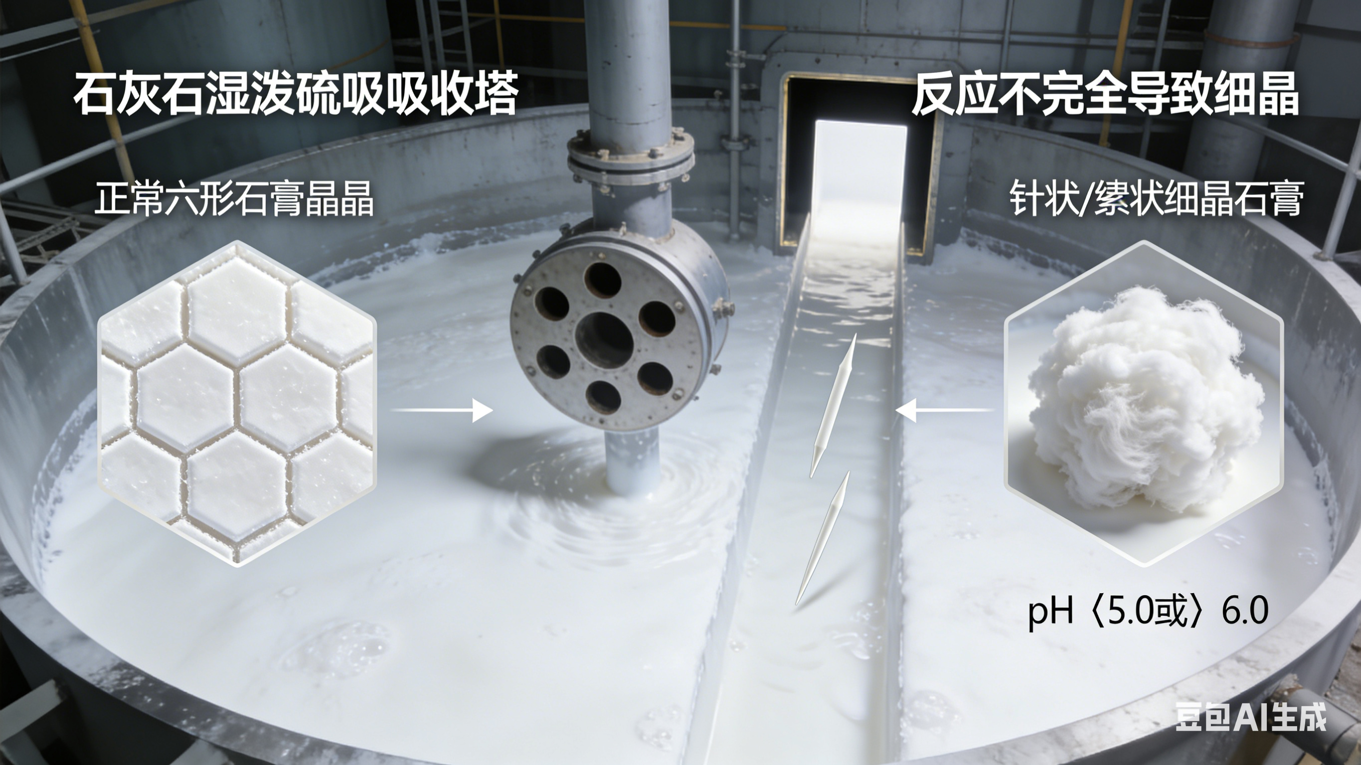 同時(shí),吸收塔內(nèi) pH 值控制不當(dāng)(過低<5.0 或過高>6.0),會抑制石膏晶體正常生長,產(chǎn)生大量針狀或絮狀細(xì)晶,進(jìn)一步加劇脫水困難。
