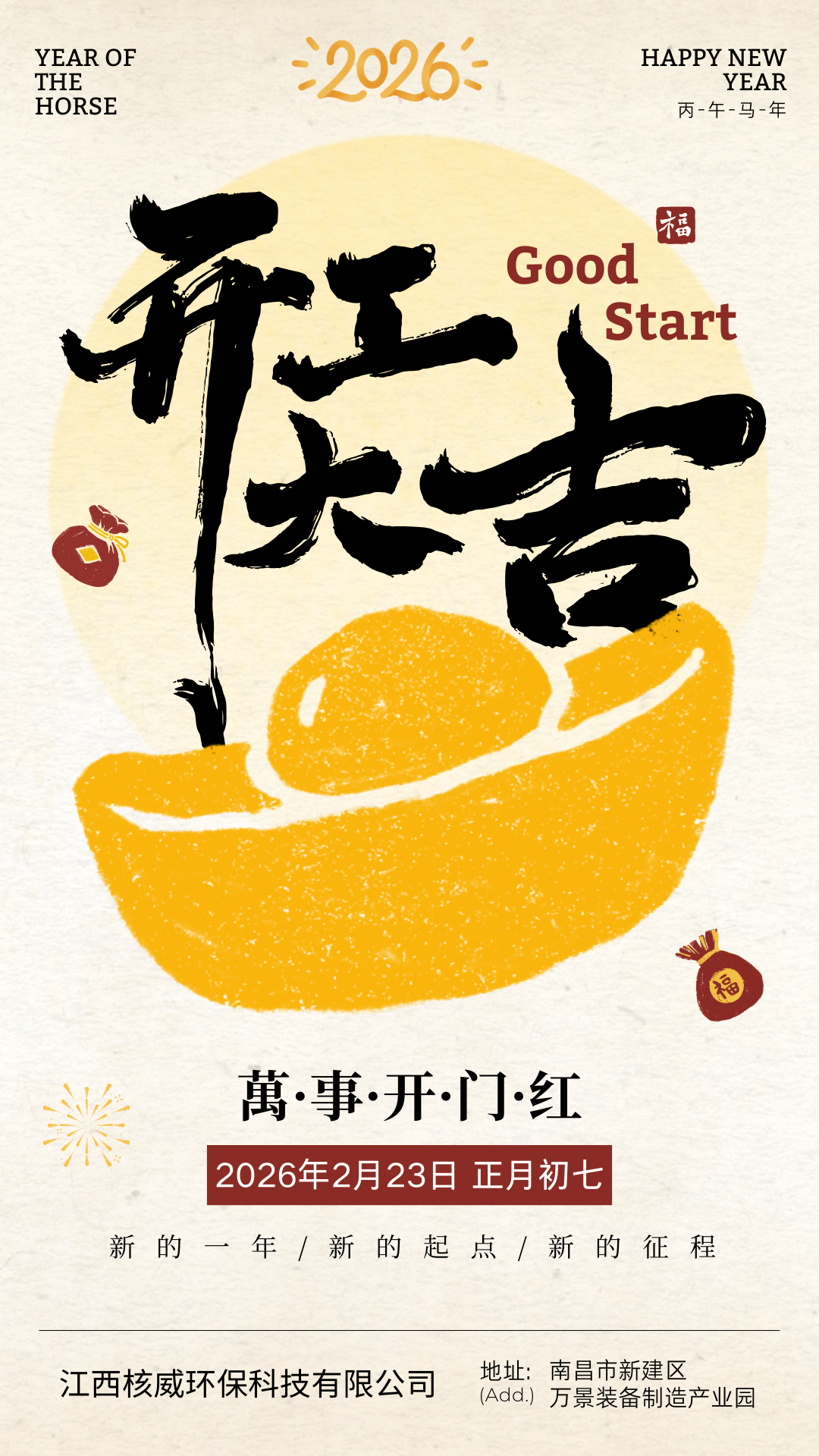 告別新春佳節(jié)的團圓與休憩,帶著對綠色未來的期許與熱忱,江西核威環(huán)??萍加邢薰菊介_啟2026丙午馬年的奮斗新篇章!今日開工,愿所有美好如期而至,所有努力皆有回響,愿我們以精工之力賦能環(huán)保事業(yè),以奮進之姿續(xù)寫行業(yè)榮光。